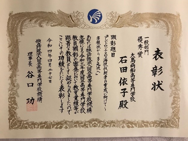 本校商船学科所属の石田 依子 教授が,令和3年度国立高等専門学校教員顕彰『優秀賞』を受賞しました。