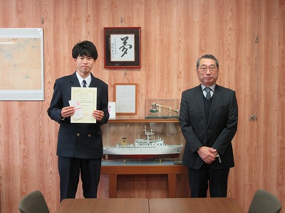 賞状と副賞を手にする小野坂君(左)
