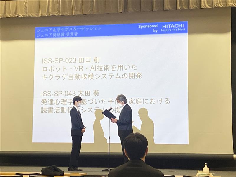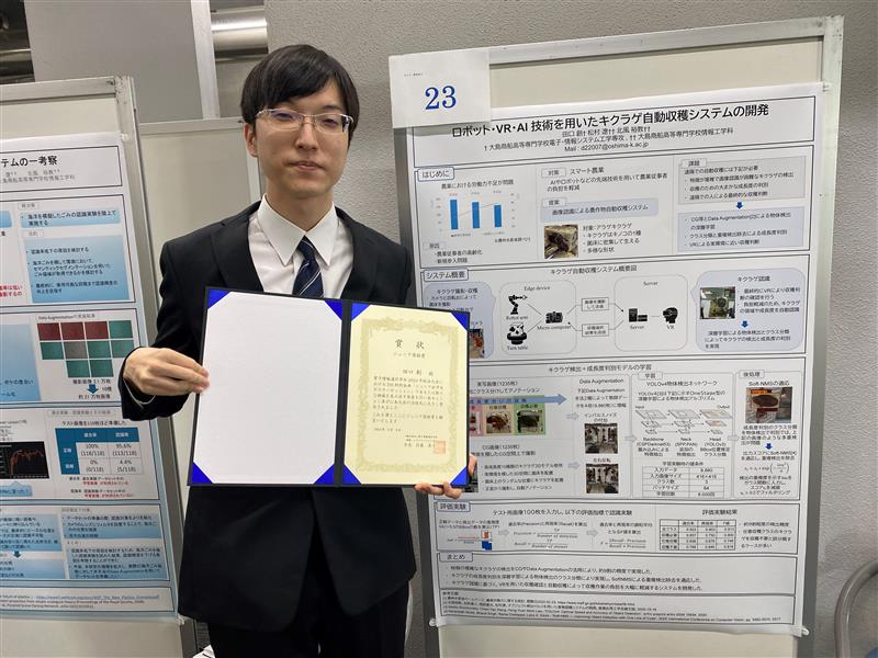 2023年3月8日(水)に開催された電子情報通信学会総合大会 情報・システムソサイエティ特別企画ジュニア&学生ポスターセッションにおいて、電子・情報システム工学専攻1年の田口創さんが「ロボット・VR・AI技術を用いたキクラゲ自動収穫システムの開発」というタイトルで研究発表を行い、ジュニア奨励賞を受賞しました。