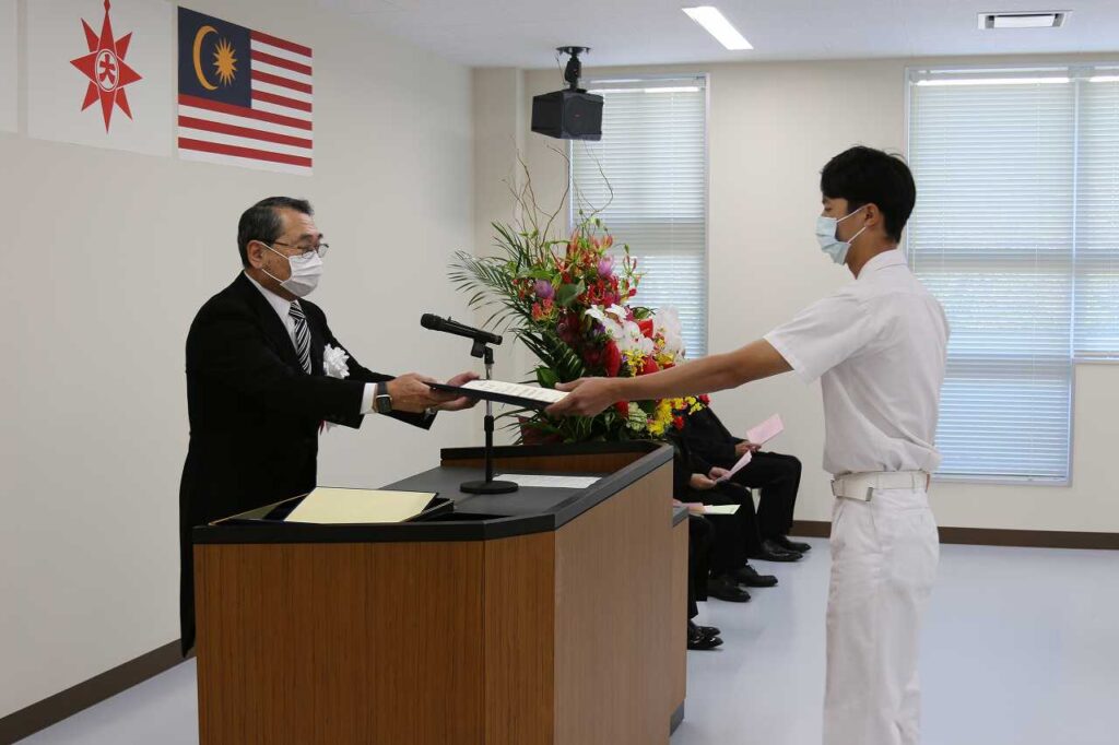 令和2年9月29日(火)、本校は、令和2年度卒業証書・専攻科修了証書授与式を挙行しました。今年度の卒業生・修了生は、本科商船学科38名(航海コース20名、機関コース18名)、専攻科海洋交通システム学専攻3名でした。