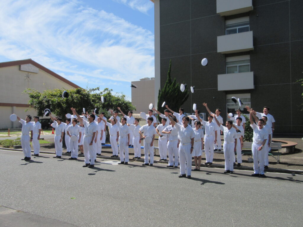 式終了後、卒業生は、出航時の儀式である登檣礼(とうしょうれい)にならって「ごきげんよう」と3回叫び、帽子を高く投げました。