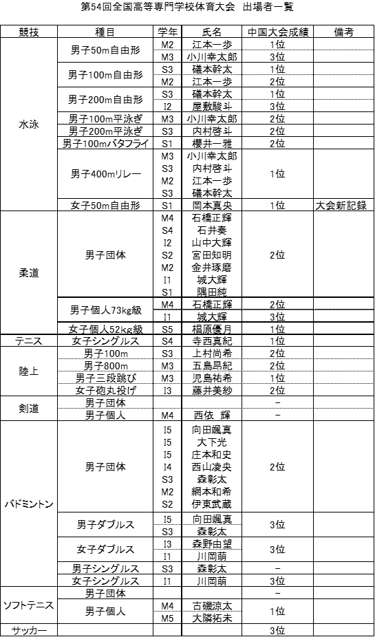 令和元年7月5日(金)~7月7日(土)に開催された、第55回中国地区高等専門学校体育大会において、下記のとおり、本校の学生の第54回全国高等専門学校体育大会出場者が決定しました。8月に開催される全国大会での活躍が期待されます。