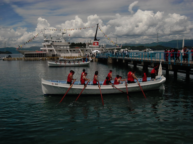 東京オリンピックの熱気が残るなか、8月8日(日)広島商船高専で第36回瀬戸内3商船漕艇大会交流戦が行われた。先ずは本戦となるA艇戦。連日の猛暑のなか練習を重ねてきた大島商船Aクルーは、(と云いたいところだが、実際には直前まで前期末試験で練習は6日の1日のみ。前日の7日は体力温存のため休み。)スタートは広島商船に出遅れたものの得意のターンで距離を詰め復路では猛烈に追い上げを見せ、約1挺身差でゴールを切り優勝をもぎ取った。