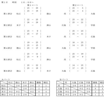 | 結果 | 7月2日(土):リーグ戦 津山高専:2-0,(25-7,25-22) 米子高専:2-0,(25-8,25-16) 7月3日(日):決勝トーナメント (準決勝)呉高専:2-0,(25-19,25-16) (決勝)松江高専:1-2,(25-20,21-25,16-25) |