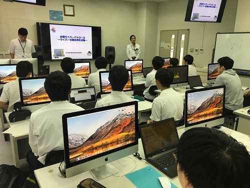 令和元年8月20日(火)に本校のコンピュータ部の学生17名が、山口県警生活環境課と柳井署の警察官の指導のもと、サイバーパトロールの講習を受講しました。講習会では、ブランド商品の模倣品を販売する違法サイトを容易に見つける手法や、疑わしいサイトを見極めるための技術的な手法について教わり、実際にインターネットの検索機能を利用して違法サイトと疑われるサイトを調べました。また、不適切な内容が記入されたツイッターの記事を見つけて、通報サービス業者へ的確に連絡する手法も学びました。短時間で多くの疑わしいサイトを見つけることができた情報工学科3年の岡村一矢部長は、「警察官の方が親切に指導してくれたので非常に勉強になった。今後はサイバーパトロールに協力して、ネットに不慣れな人たちのために被害を未然に防ぐために努力していきたい。」と話していました。