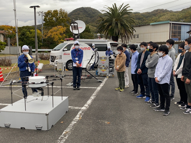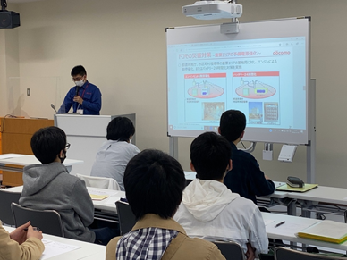 本年度の取り組みとして、令和2年11月19日(木)にNTTドコモの災害対策の専門家を講師として招き、「災害復旧の事例」「基地局の概要」「5G」についての特別講義と、災害時用機器の実物紹介を実施しました。