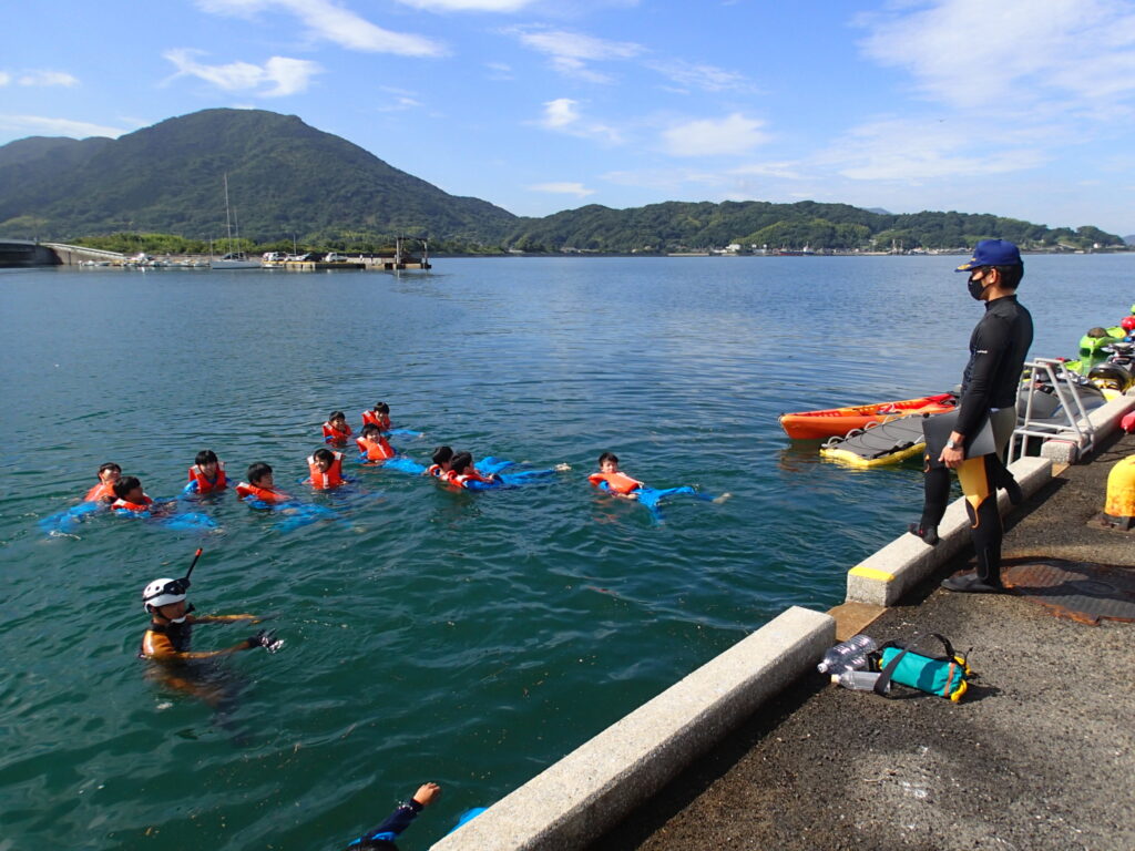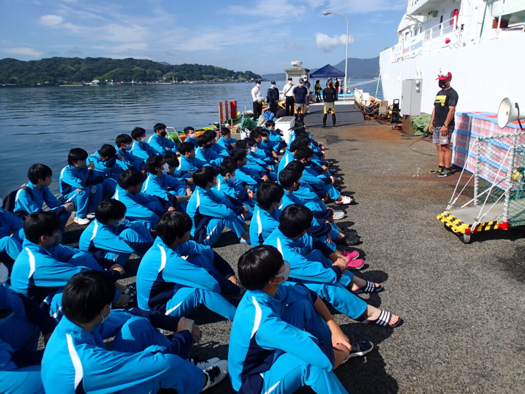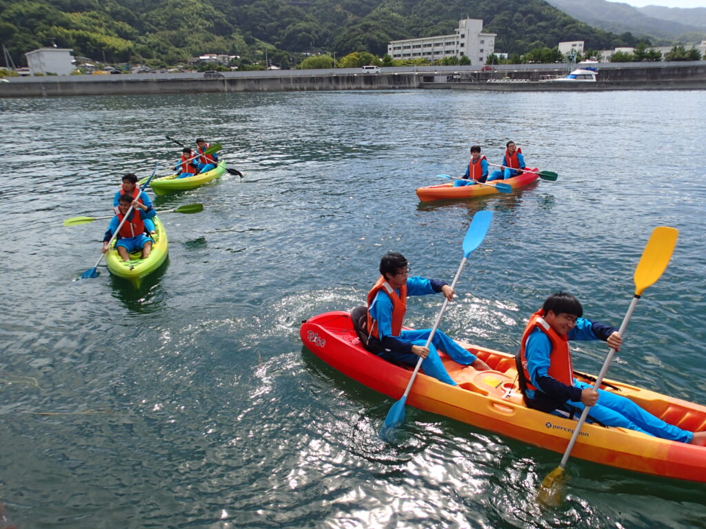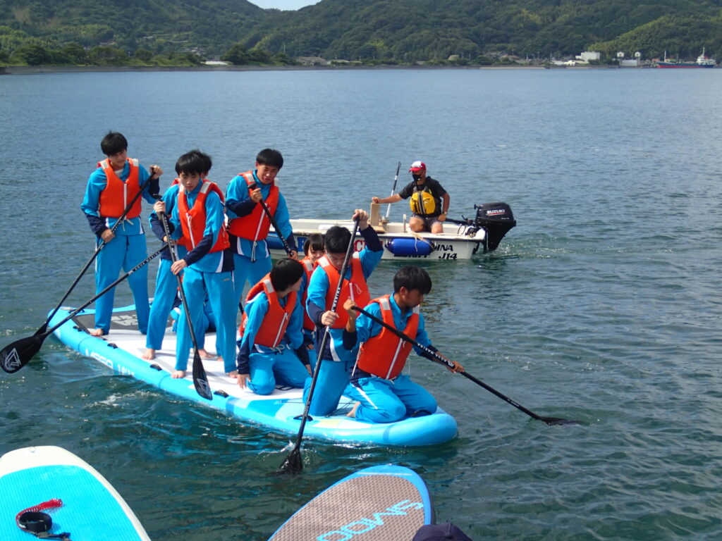 地域と連携した特色ある授業展開の一環として8月10日、保健体育授業「海洋体験実習」を5年ぶりに実施しました。新型コロナウイルス対応や台風等の天候不良のため4年連続で実施を見送っていましたが、今年は天候にも恵まれ無事実施することができました。