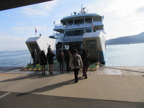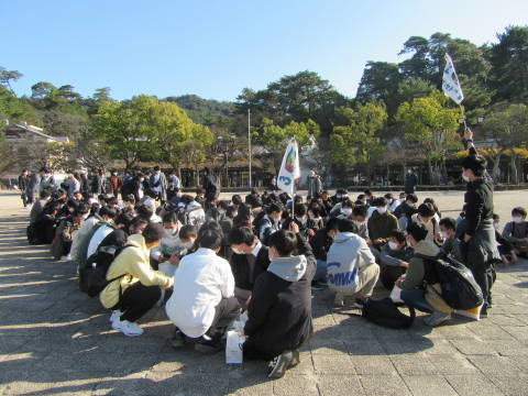 大島商船高等専門学校から借上げバスに乗車して宮島口にて下車後、フェリーで宮島に向かいました。晴天に恵まれる中、宮島内の自由散策を通して、親睦を深めた1日となりました。