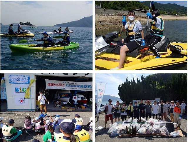 参加者は砂浜や岩場に落ちたごみを拾ったり、カヌーや救助艇を操って網で漂流するごみをすくったりしました。本校もPWCレスキュー同好会の女子学生が水上オートバイで海上のごみを回収しました。