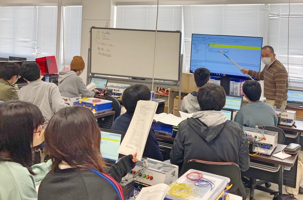 令和5年3月22日(水) 、23日(木)の2日間、プラントや製造業の自動化の要となるシーケンス制御の実践的技術者を目指すPLC特別講習会を、本校電子機械工学科の4年生20名の参加により開催しました。