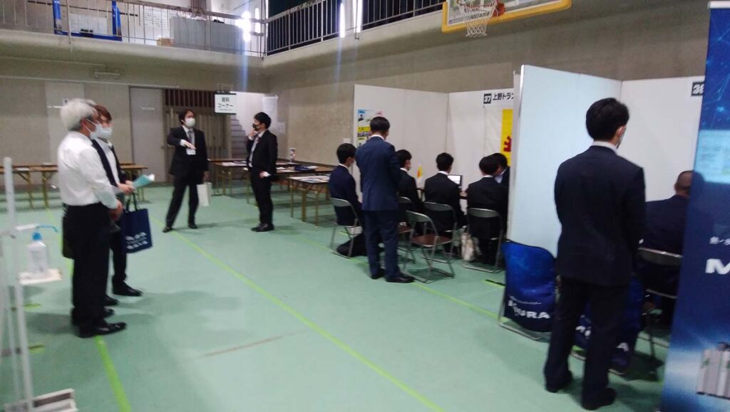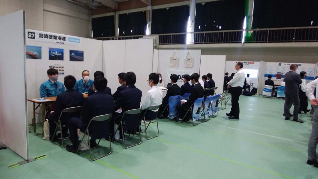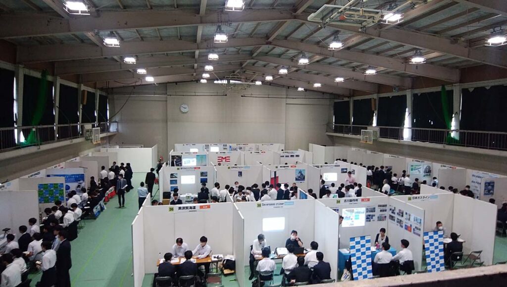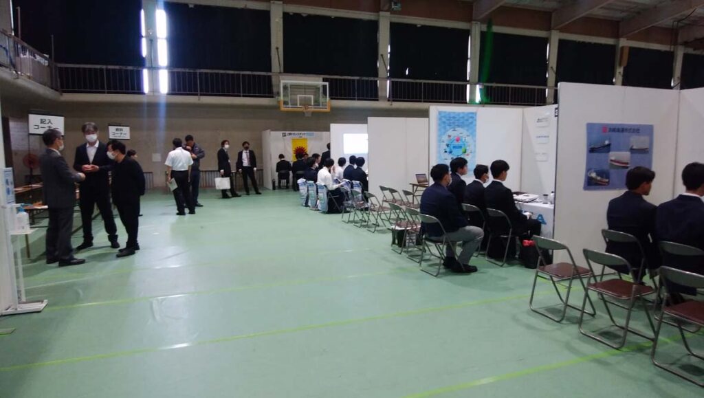 会場となった弓削商船高専(第一体育館)には、午前と午後合わせて約80社を超える出展があり、海運会社のみならず船舶管理会社や機械メーカーなど、商船高専卒業生の就職先として採用実績のある会社が多数来場しており、学生も各社ブースにて真剣に耳を傾ける等、有意義に時間を過ごすことができました。