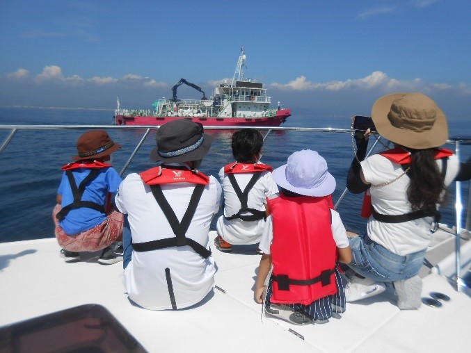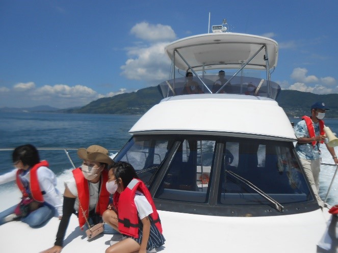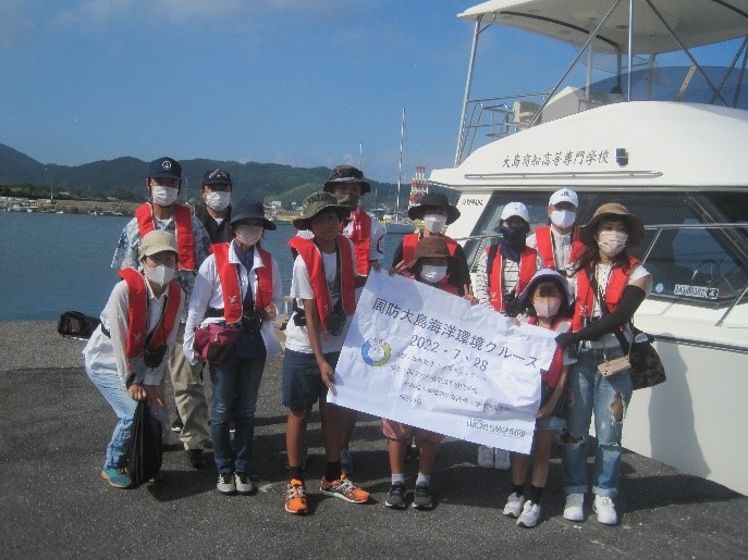 令和4年7月28日(木)に、主催:屋代島さとうみネットワーク、協力:国土交通省中国地方整備局広島港湾・空港整備事務所、海辺の会、大島商船高等専門学校による周防大島海洋環境クルーズを実施し、児童、保護者等を含め15名が参加しました。これは、大島商船高専の実習船「すばる」により、周防大島北東部の海域を航行して、浮遊海ゴミの実態を調査し、岩国沖合にて国土交通省中国整備局が所有する海面清掃船「おんど2000」による、浮遊大型発泡スチロール、流木等の回収作業を実際に見学するものでした。当日は晴天で、非常に暑い日照りでしたが、船が航行すると心地良い風に吹かれ、また波穏やかなクルージング日和となりました。