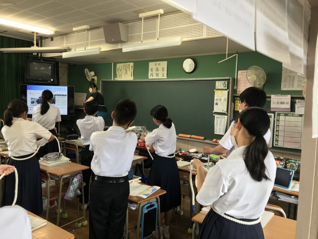 その後、地域のハザードマップや家の中のハザードマップの危険・安全エリアの確認やロープワーク演習、防災グッズ紹介等を行いました。児童や生徒は積極的に質問するなど、熱心に聴いていました。