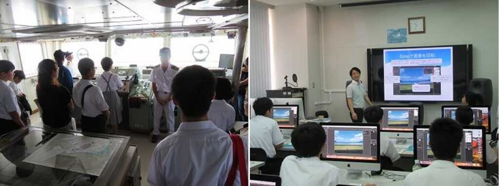全体説明の後、参加者は本校学生の案内により、各学科の体験学習や施設見学、大島丸体験航海等をしていただきました。また、1日コースの参加者の方には学生寮での昼食体験もしていただきました。
