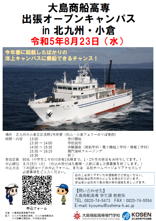 北九州市・小倉港にて「大島商船高専出張オープンキャンパス in 北九州・小倉」を開催します。各学科の体験講座と、新大島丸での関門海峡クルージングを実施します。