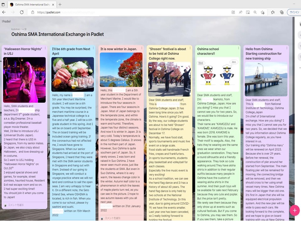11月から、SMAとのPadletを用いた交流を開始しました。これまでSMAとは、ブログを用いての交流をしてきましたが、ブログ運用が困難となったため、Padletによる交流に切り替え、試運用することでSMAとの合意を得ました。マンスリー更新を予定しています。来年度には、SMA学生受入、本学生派遣を再開し、Padletを対面前の事前交流のツールとして使用する予定です。興味のある学生は国際交流室長(商船学科 久保田)までお問い合わせください。