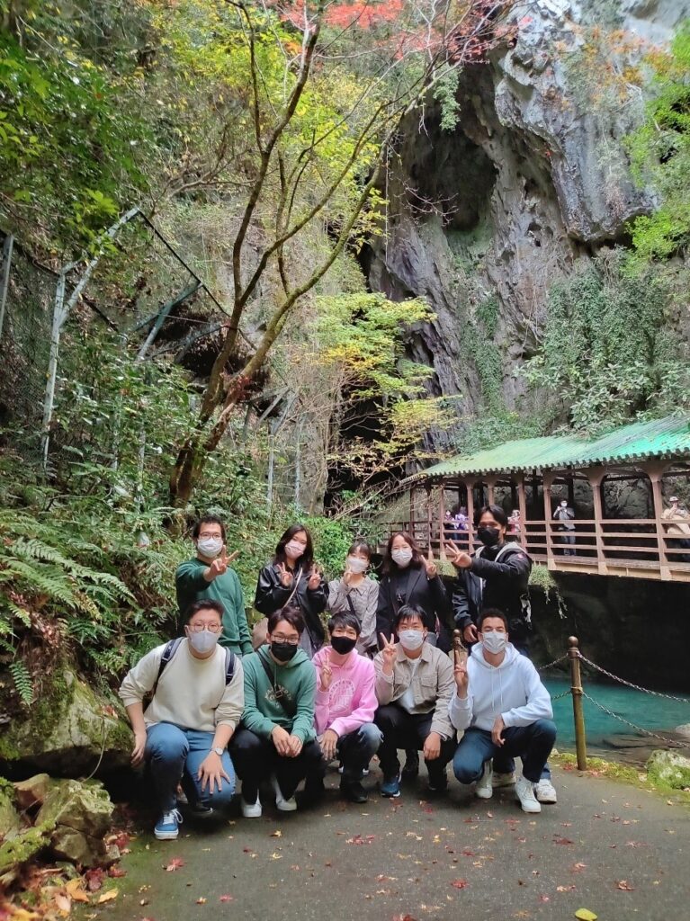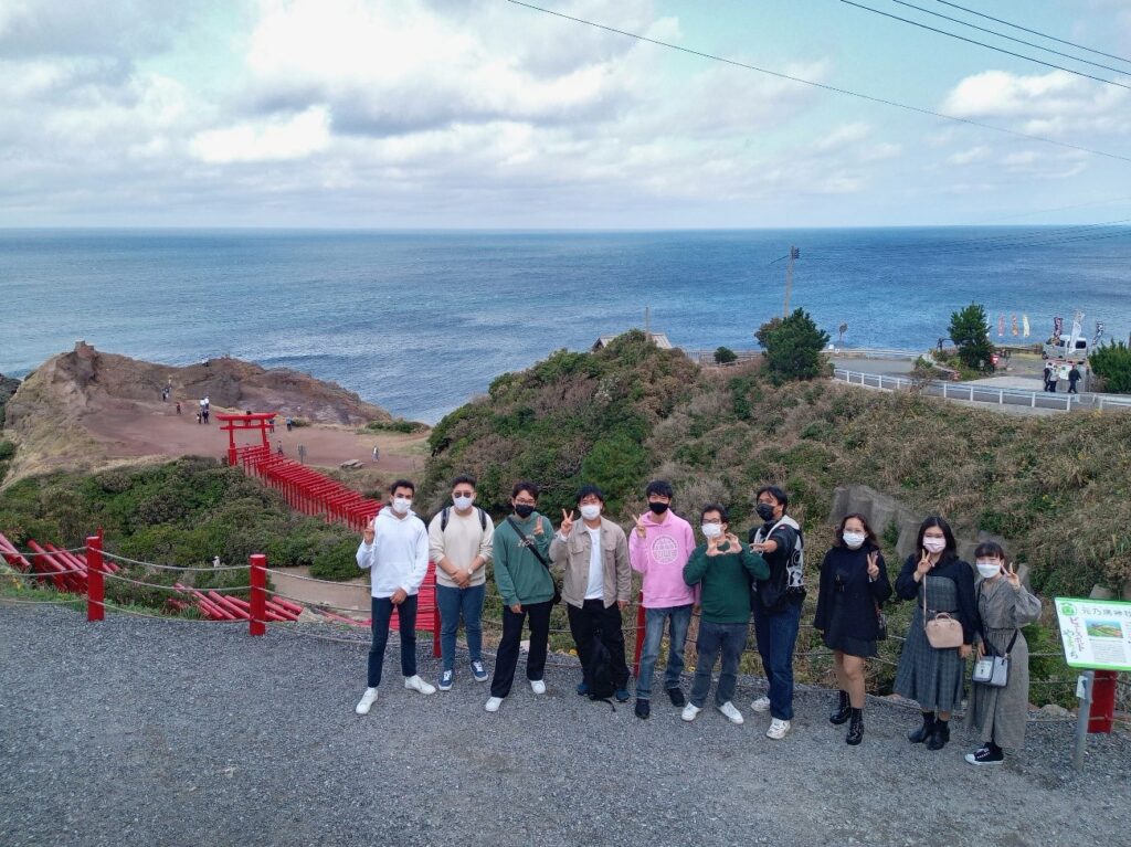 2022年11月13日、本校留学生および日本人チューター学生の10名と国際交流室の教員2名で、角島、元乃隅神社、秋芳洞へ研修旅行に行きました。この旅行は、日本の文化や景色を体験し日本事情を理解してもらうとともに、留学生と日本人学生の親睦を深めることを目的として実施しています。例年、1泊2日の行程で実施しておりましたが、昨年、一昨年前と新型コロナウイルス感染症の広がりのため中止しておりました。今年度は、日帰りではありますが、3年ぶりに実施することができ、学生は全員初参加になります。今回の研修旅行では同じ県内でも普段は行くことのない場所に行くことができ、参加者は見聞を広げることができました。