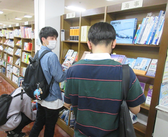 当日は、商船学科小林准教授と電子機械工学科小林助教の引率のもと、図書委員の学生等12名が参加しました。クラスの要望を事前にまとめたり、普段足を踏み入れないジャンルの棚へ行ってみたり、専門書を真剣に悩みながら選書したり、皆、積極的に参加していました。ブックハンティングによって選定された図書は、図書館に入荷され次第、随時貸出しを開始する予定です。