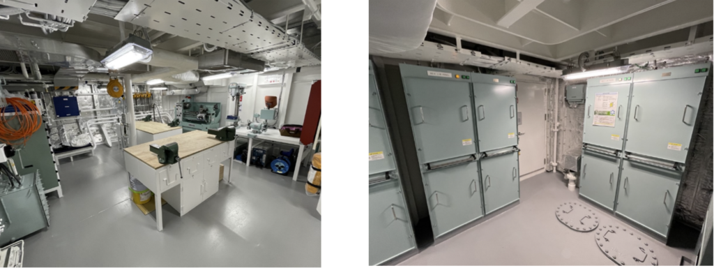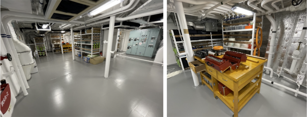 最下段の船倉甲板には、エンジンルームと繋がる機関工作室がある。