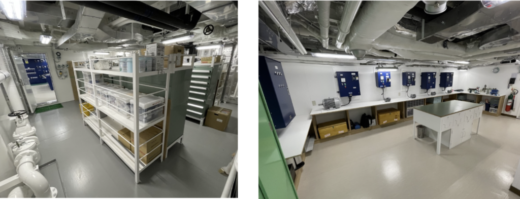 航海当直でない方の班は、ここで配管の組立てや工具の取扱い実習を行う。