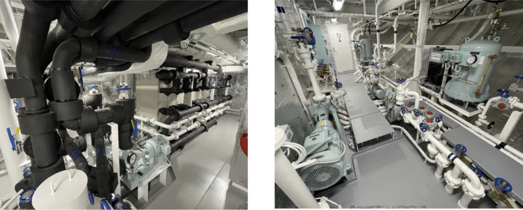 以前紹介したチラー式の空気調和機室や船内に清水を送り出すポンプルームでは、ボットムオフィサーやボットムエンジニアとして乗船したら直ぐに扱う機器が揃っている。