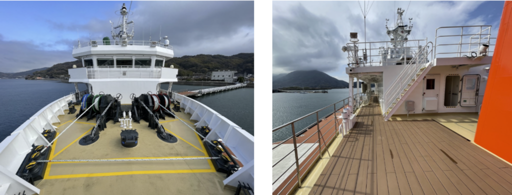 手前の白い柱は、錨のチェーンをロッカーに収めるためのパイプなんだよ。