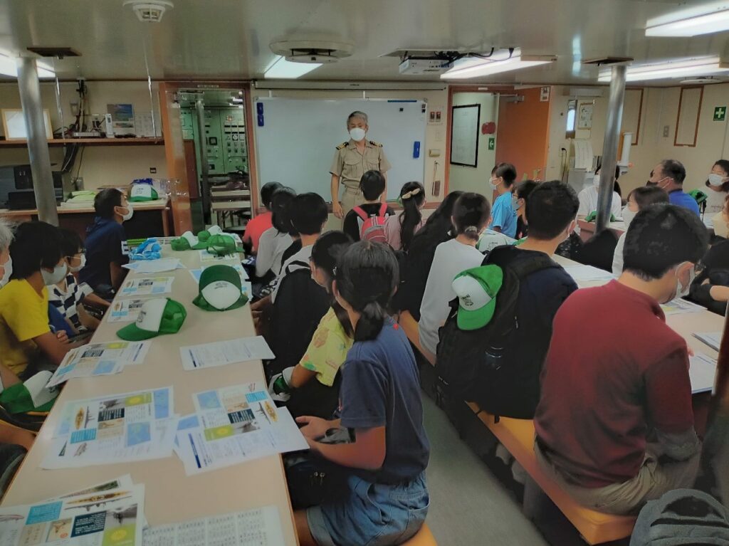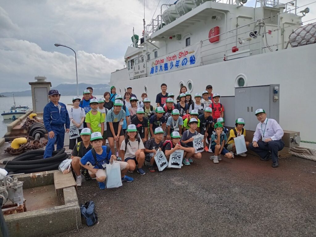 2022年8月5日(金)に本校練習船大島丸を使って周防大島少年の船「洋上セミナー」を実施しました。周防大島町の小学校6年生を対象に実施されているもので、今回で27回目になります。今年は26名が参加しました。例年、呉、江田島、宮島と3日間かけて船内宿泊を体験したりするのですが、今年度は新型コロナウイルス感染症を考慮して周防大島一周となりました。途中戦艦陸奥が沈没した地点で停泊し献花を行いました。船内見学やロープワークを実施し、昼食には防災食を体験しました。子供たちは海側から自分たちの住むところを見る機会は少ないため、大変貴重な機会になったものと思います。