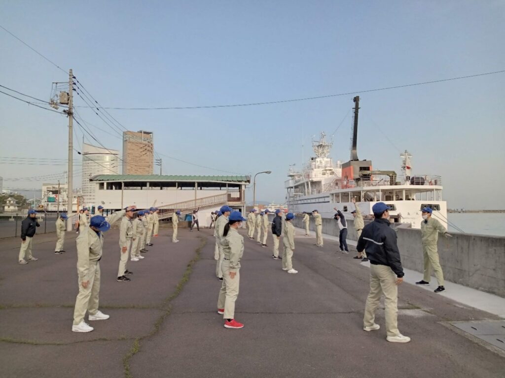 高松港でシンボルタワーを背景に、旧フェリー岸壁での朝の体操
