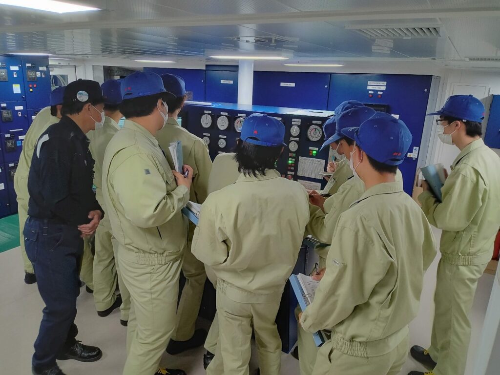 機関制御室にて、エンジンコンソール実測実習