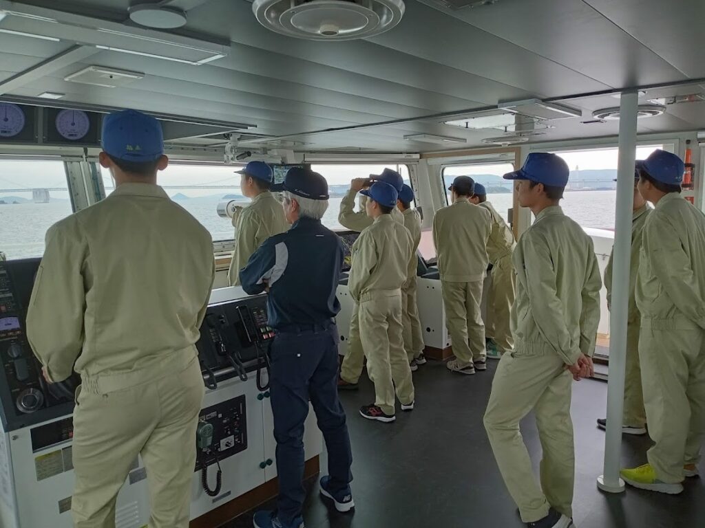 2023年5月24日から5月26日までの3日間、商船学科4年生が丸亀港、高松港への航海実習を行いました。2日目は19時に高松港を出港し、備讃瀬戸東航路と備讃瀬戸北航路の夜間航行を体験しました。普段遭遇することのない「ながせ網」や「ばっち網」等の、漁ろうに従事する船舶と遭遇することができました。今航海からマスクを外しての実習となり、久しぶりに笑顔があふれる航海となりました。