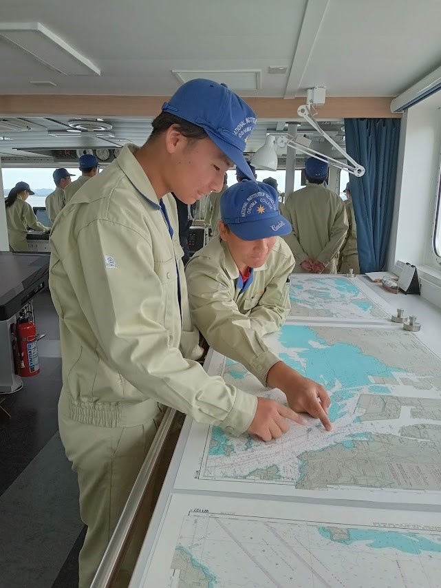 水島航路を航行し港内航路に入るため、チャートを確認している様子(航海コース学生)