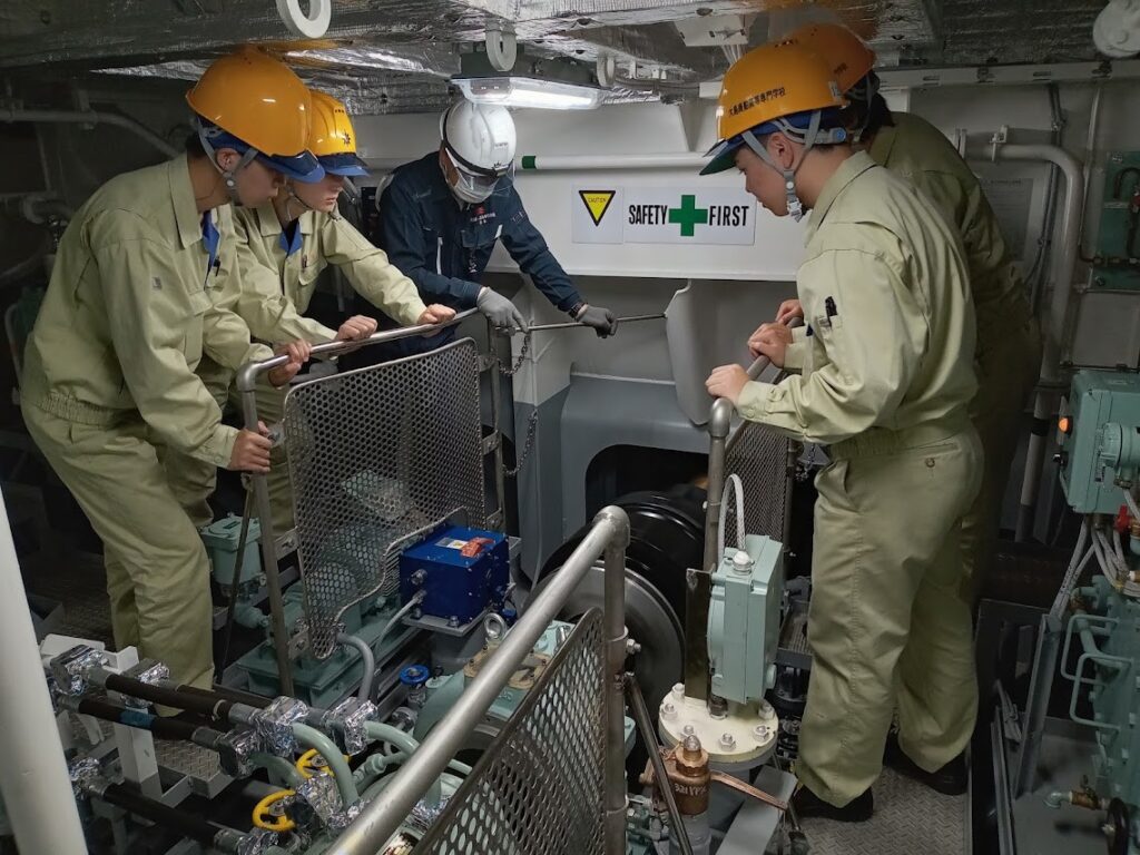 エンジンルーム船尾部において、プロペラ軸のチェック(機関コース学生)