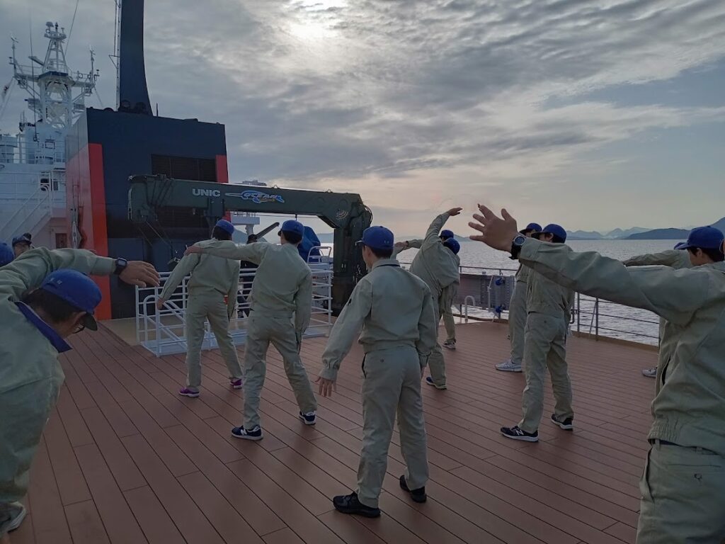 3日目の朝、ひうち灘で錨泊中における朝の体操(機関コース学生)
