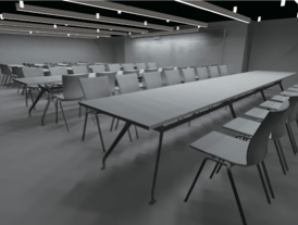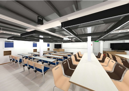 その両方を解消するために、前を向いて目線が合う授業形式がとれる左舷側机と、海図を広げて実習が行える幅のある右舷側の机とをセパレートで配置している。