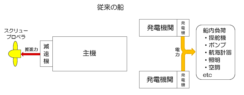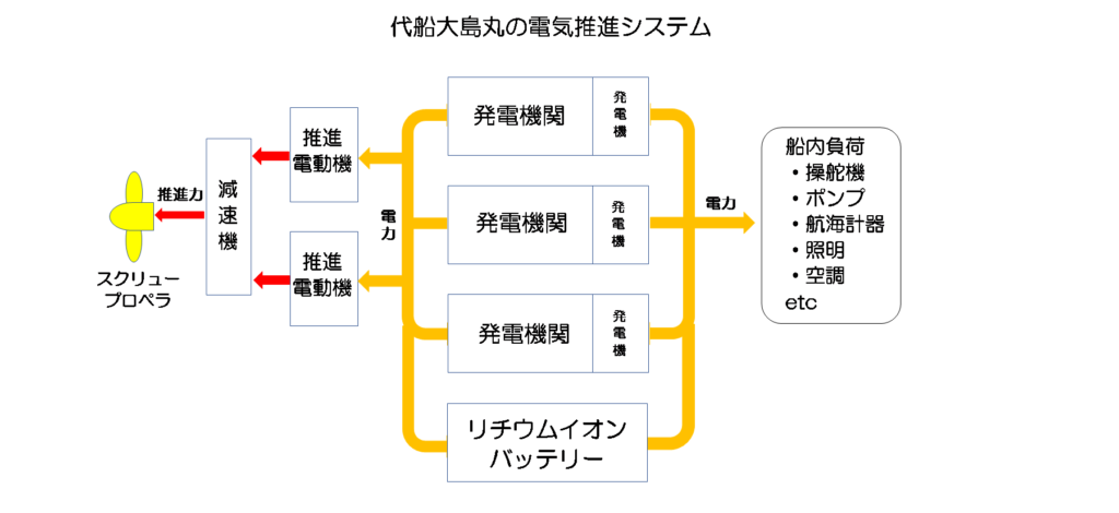 それ以外にも、従来の船だと主機と発電機関で別々の予備品を揃えたり、それぞれの整備作業を覚えたりしなければならなかったが、電気推進船だと同じ型の発電機関が複数台あるので、予備品を共通にできるし、単一整備作業になるというメリットもある。