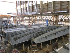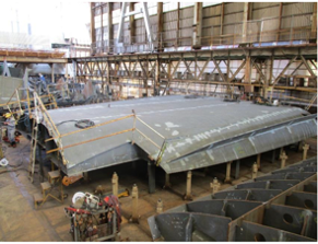 船体構造を幾つかのブロックに分割して定盤(陸上)で完成させて、船台に載せ、溶接により結合、完成させる方式ですよね。