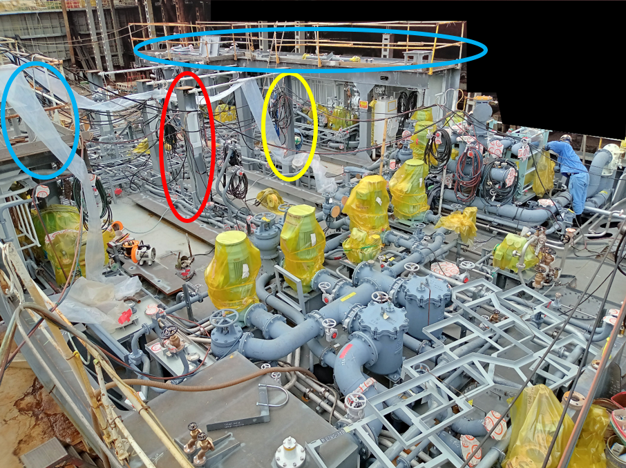 エンジンや推進電動機はまだ搭載されていないけれども、補機類(黄色いビニールを被せられたポンプ等)がどんどん設置されている様子がわかるね。