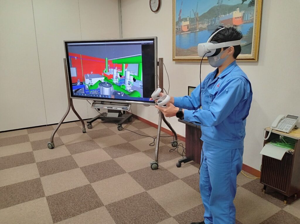 三菱造船でのVRによるエンジンルーム内の検証の様子