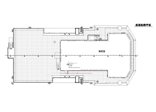 これは、船橋甲板船尾部から、船首部のブリッジを見たところだ。