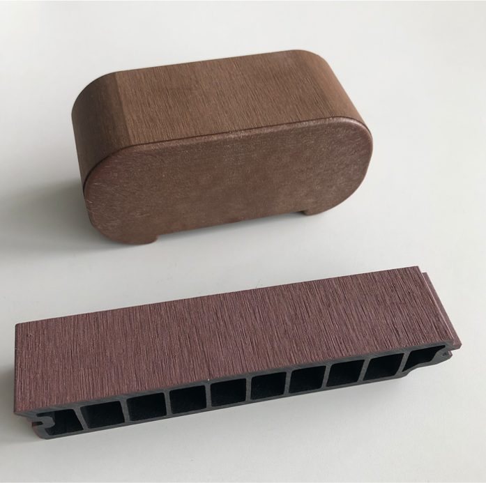 採用した人工木のサンプル上が手摺で、下が木甲板のもの。