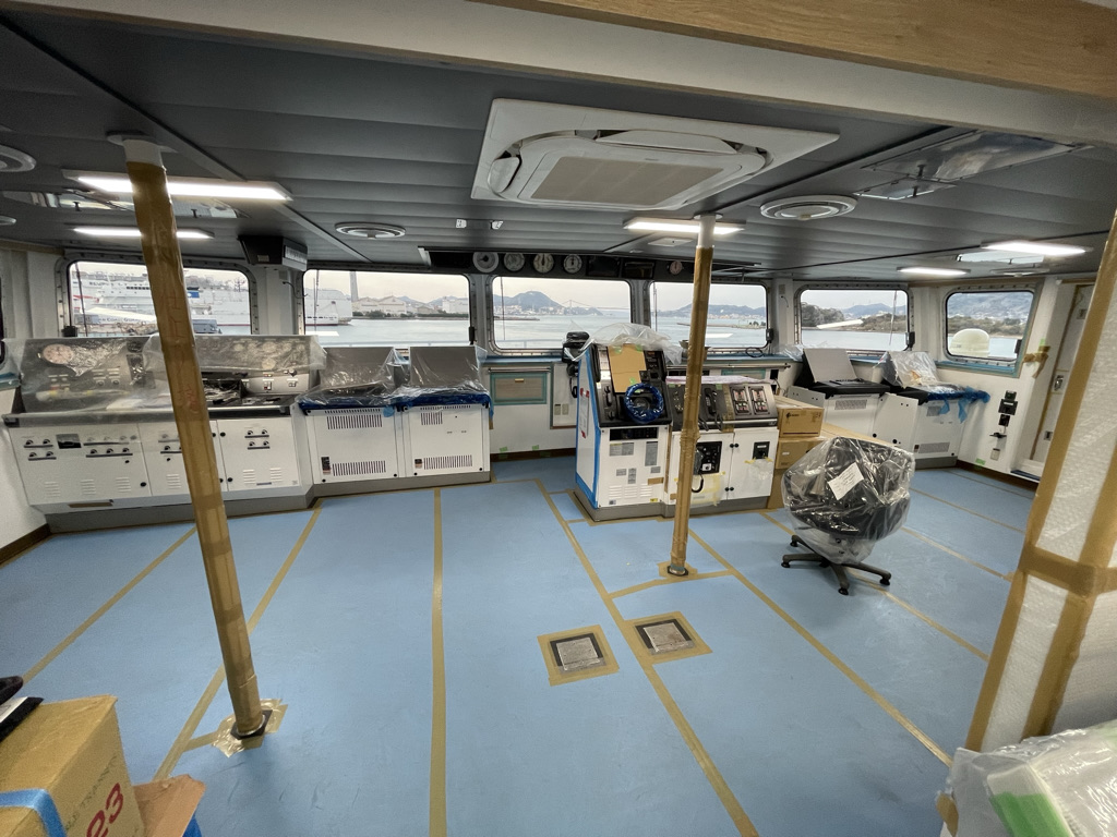 試験中、ブリッジ内では20名以上の作業員が確認作業を行っていたのに窮屈さはなかったね。ECR(機関制御室)でも同じ状況だった。