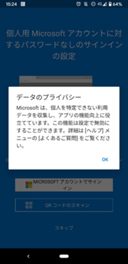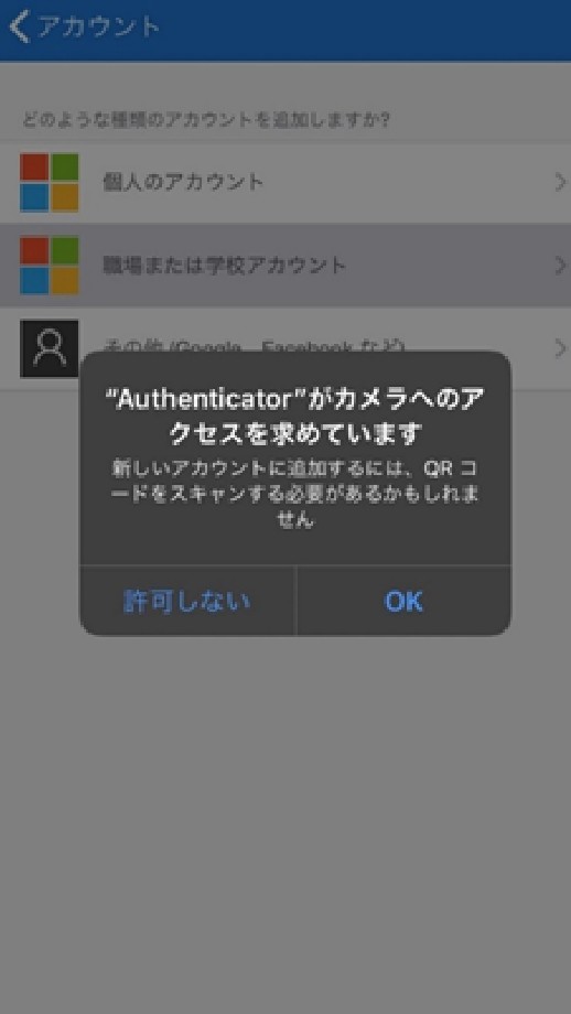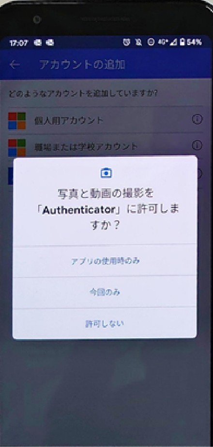 このとき「Microsoft Authenticator」がAndroid端末では「写真と動画の撮影」、iOS端末では「カメラ」の許可を求めてきますので許可してください。