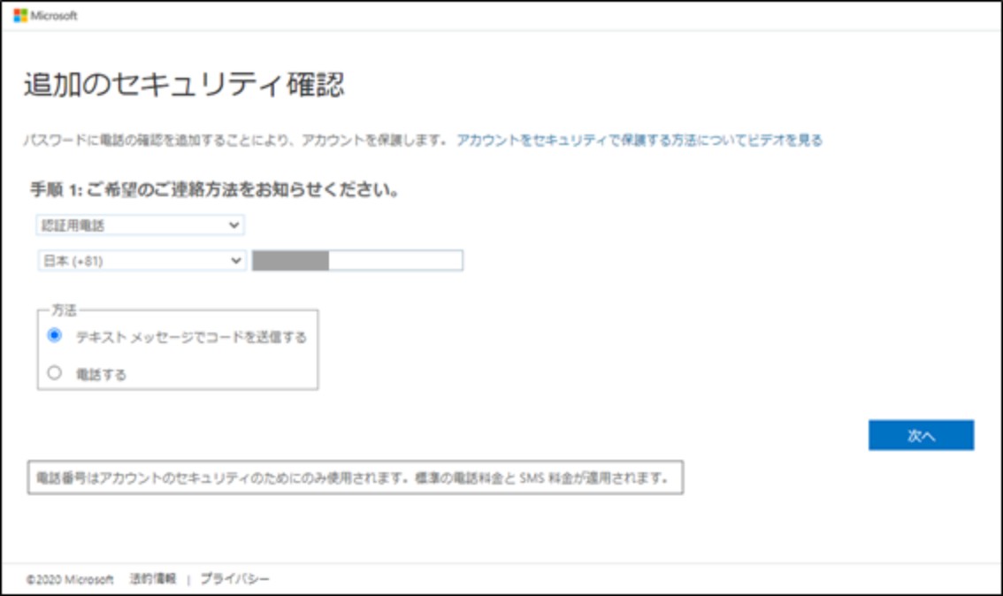 「方法」は、SMS認証を利用する場合は[テキストメッセージを送信する]を、電話認証を利用する場合は[電話する]を選択し、[次へ]をクリックします。
