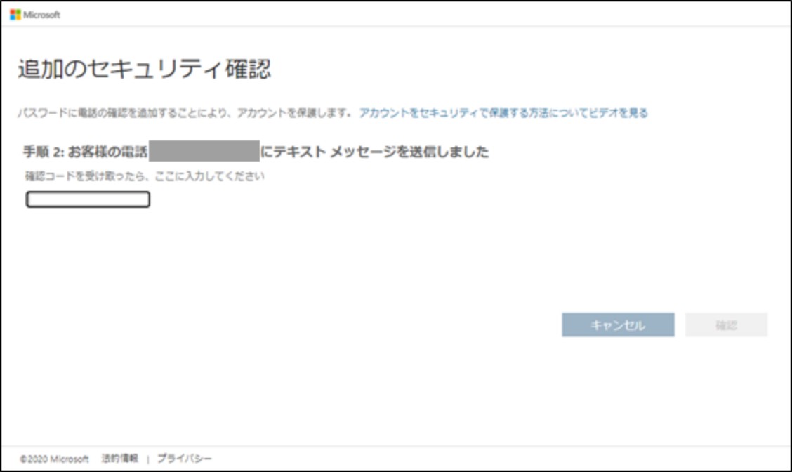 SMS認証を利用する場合は以下の画面が表示されます。ご自身の携帯電話にテキストメッセージが送られてきますので、メッセージに記載されているコード(6ケタの数字)を入力し、[確認]をクリックしてください。