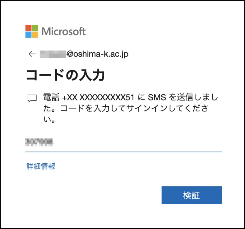 5. 4.で選択した方法で取得したコードを入力し、[検証]をクリックします。