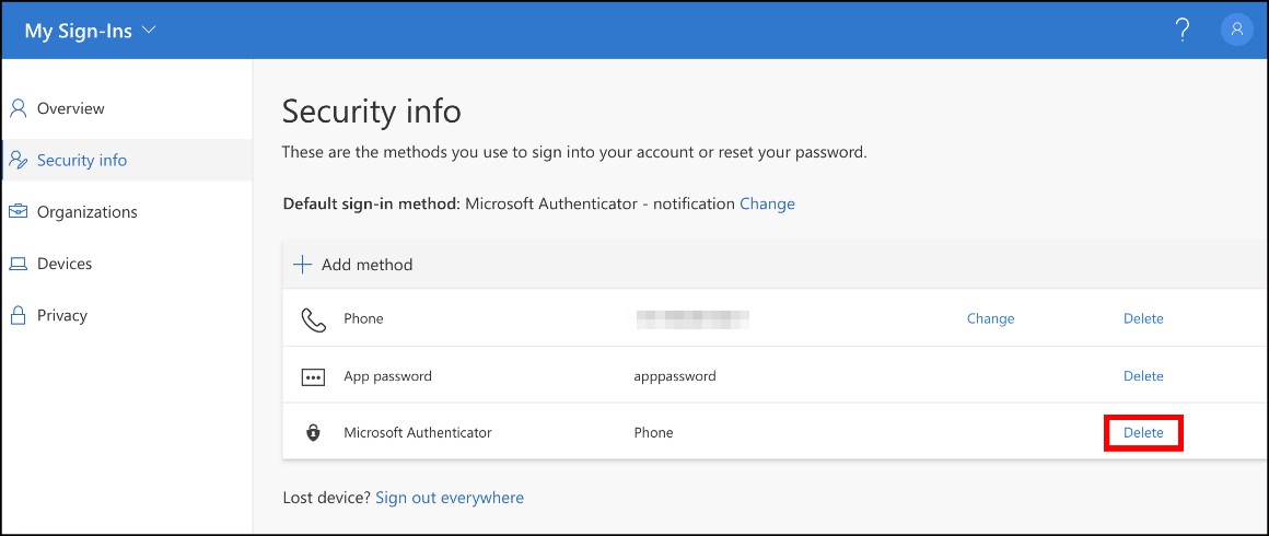 8. 以下の画面が表示されるので、「Microsoft Authenticator」の[delete]をクリックして旧スマートフォンのAuthenticatorの設定を削除します。