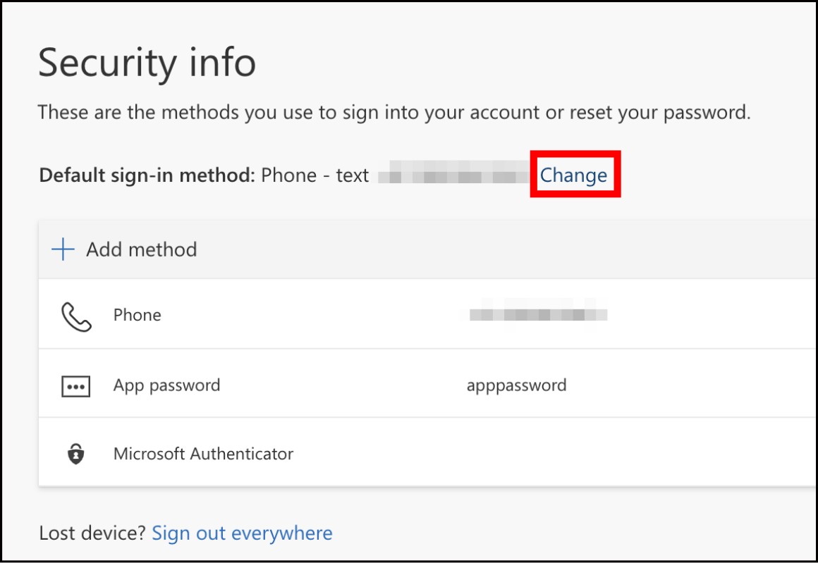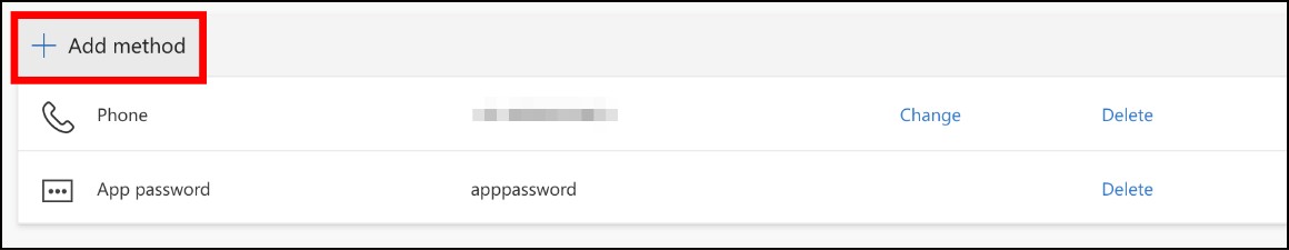 10. 「セキュリティ情報(Security info)」の画面で[+ add method]をクリックします。