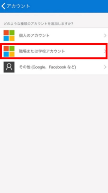 17. スマートフォンにて、以下の画面で[職場または学校アカウント]をタップします。