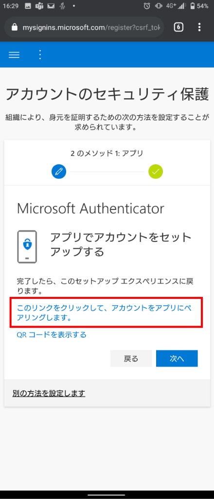 Microsoft Authenticatorアプリにアカウントが登録されたことを確認したら[次へ]をクリックします。