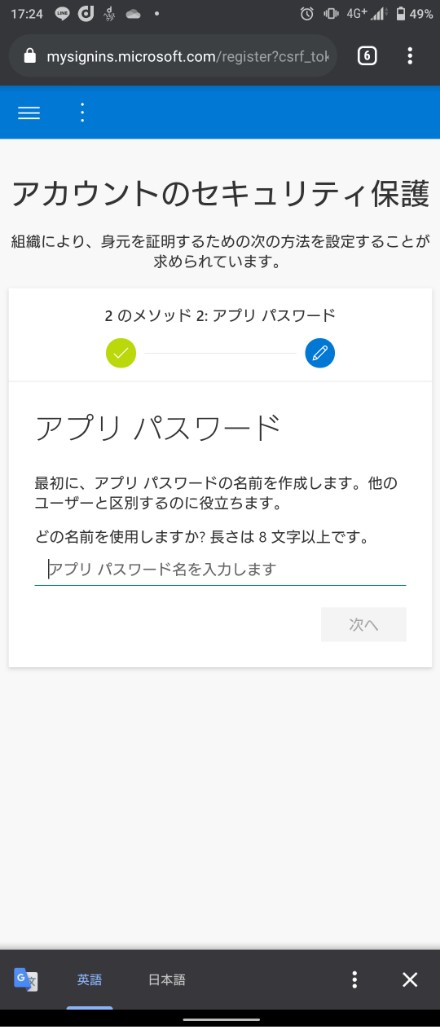 4. アプリパスワード名を入力し、[次へ]をタップしてください。